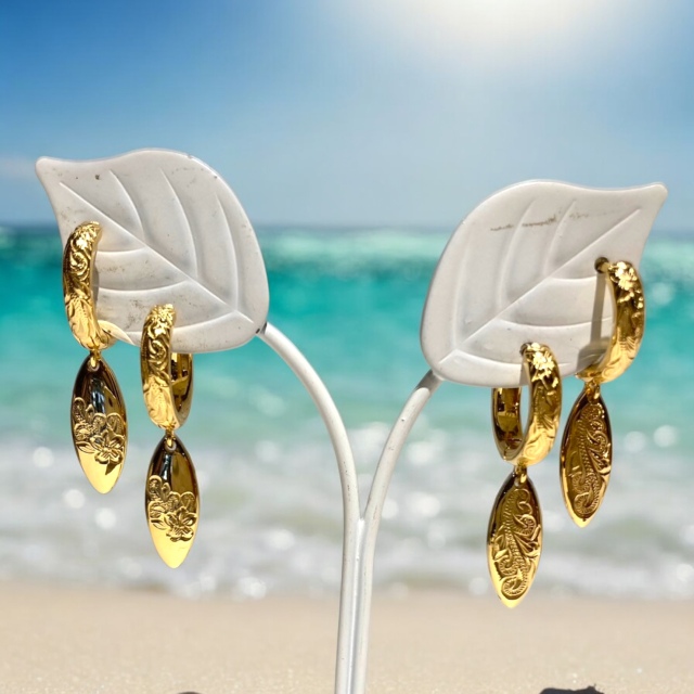 原宿のお店で人気スクロールデザインピアス ■サイズ :、13×幅3mm厚み2mm ボード15×6×2 ■重量 : 1g(片耳) ■素材 : サージカルステンレス サーフボードの両面違うデザインでオシャレです。 永遠 を意味するスクロール柄 サージカルステンレス使用のハワイアンジュエリー。 医療用に使われているサージカルステンレスは肌に優しく、金属アレルギーでアクセサリーをつけられない方にも安心です。シルバーアクセサリーより軽くて丈夫で変色しない素材ですのでお手入れ不要で海水や温泉につけても大丈夫です!