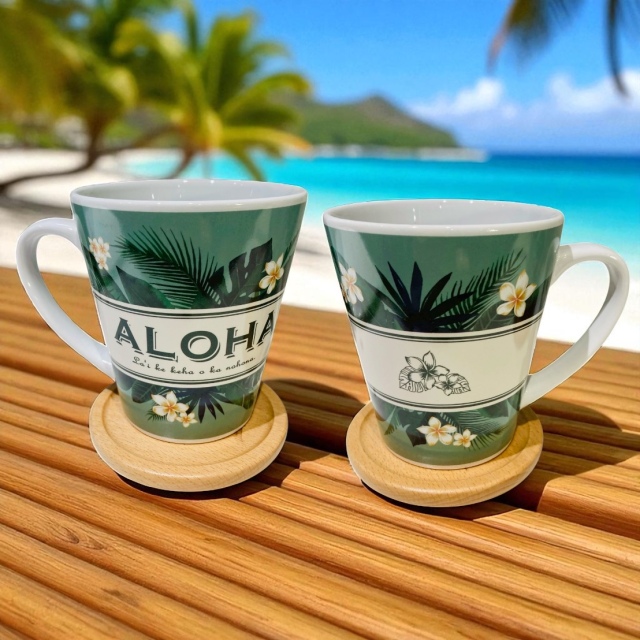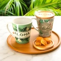ハワイを感じる爽やかなデザインのふた付きマグカップ。木製のふたはコースターや小皿にもなります。 プレゼントにもおすすめです。 サイズ 高さ 10cm 口径 9cm 容量 約ml 蓋直径9.5cm 厚み2.5cm