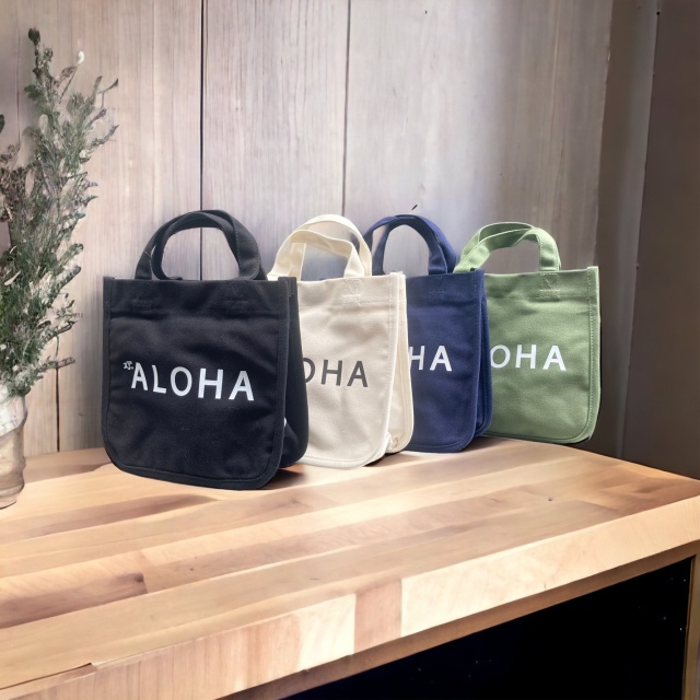 ALOHAミニトートバッグ 使い勝手が抜群で、 お弁当を入れたり、ちょっとそこまでの買い物に最適サイズ。 シンプルなデザインなのでコーディネートにも合わせやすいです。 サイズ:H23cm(持ち手含む→H31cm)x W25cm x D13.5cm サイズ H24xW21xD16cm