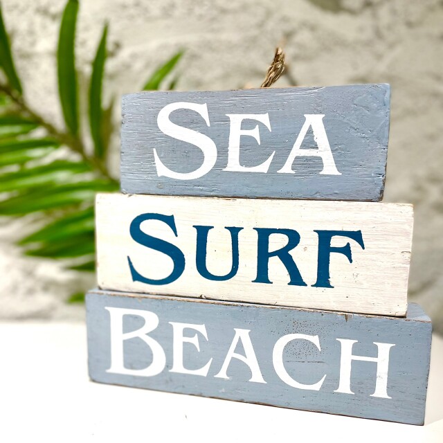 2色のウッドブロックにSEA、SURF、BEACHをデザインしたマリンなオブジェ