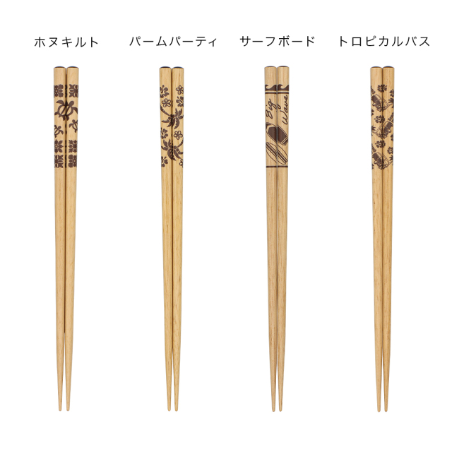 Hawaiianデザインの可愛いお箸 ハシ ハワイアン 華やかなハワイアンデザインのナチュラルな木製のお箸。 ハワイアンデザインが目をひくお箸です。 バリエーション豊かな4種類展開! にぎやかなデザインで食事も楽しくなります。 家族でお揃いにしたり、引っ越し祝いなどのギフトにもおすすめです。 サイズ 約L22.5cm